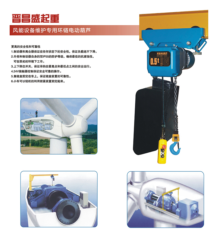風(fēng)力專(zhuān)用環(huán)鏈電動(dòng)葫蘆作為風(fēng)機機艙檢修設備,其可靠性直接影響風(fēng)機應用的可持續性,根據常用風(fēng)機設計結構,單軌吊或柔性梁輕型起重機在機艙檢修中得到廣泛應用,但因應用條件以及環(huán)境要求,起重機配置的電動(dòng)葫蘆在一些技術(shù)細節上又有別于其他環(huán)鏈電動(dòng)葫蘆。